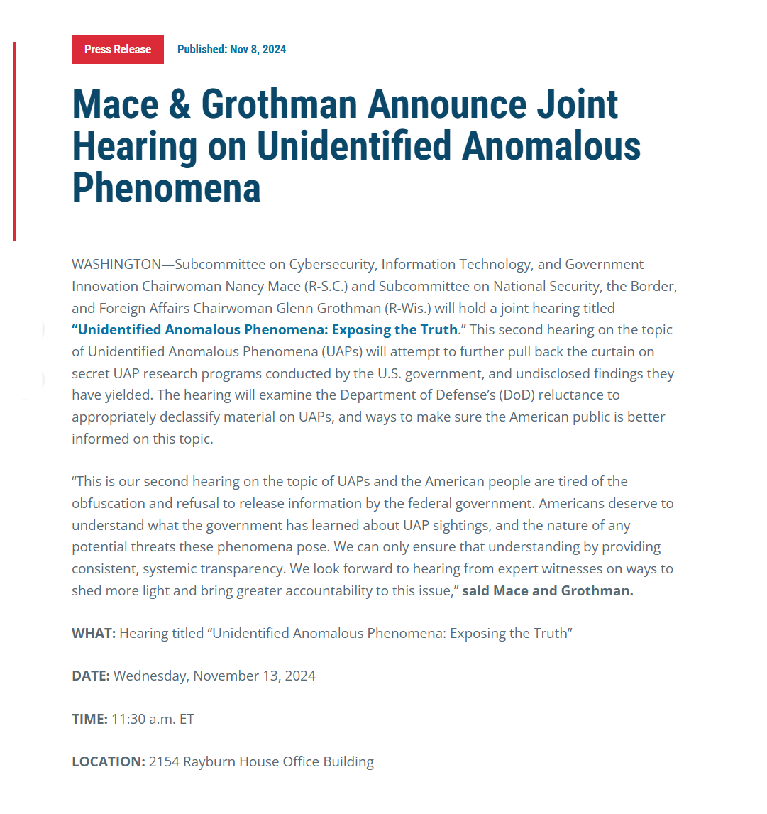 Nov 6 – the US House of Reps. posts an official notice regarding the upcoming UAP Hearing, titled "UAP: Exposing the Truth"